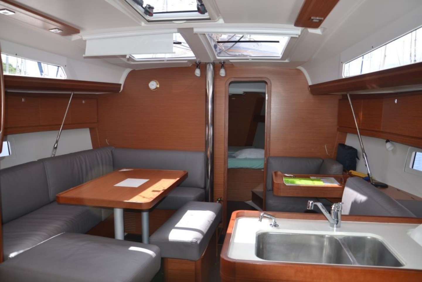 This boat is equipped with a Full batten mainsail and a Furling genoa. It has the following equipment: Auto-pilot, Outboard engine, Speakers, Deck shower.
