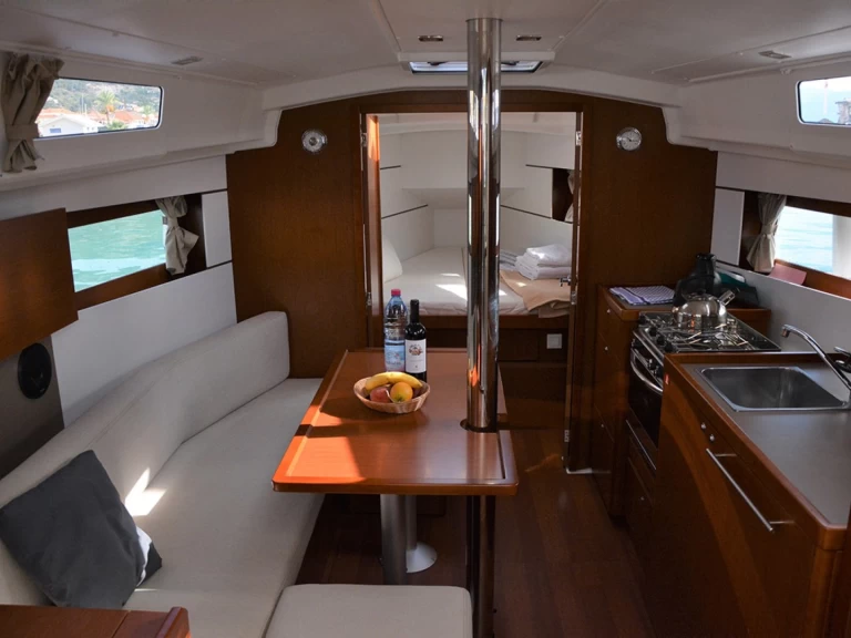 2 cabins, 1 toilet/shower. With the Oceanis 35 as the smaller sister of the Oceanis 38, which was European Yacht of the Year 2014, Beneteau has created one of the most successful, innovative yachts. A particularly idiosyncratic accent is the main sail arch, which creates more space in the cockpit, increases safety when walking on the boat and optimises the position of the sails. With her unusual, tasteful design and excellent sailing characteristics, she is the princess among the two-cabin boats. two steering wheels double rudder main sail arch electric windlass (also operated from the cockpit) bow thruster chart plotter in the cockpit folding bathing platform sprayhood, bimini diesel heater AIS receiver two 100 W solar panels Additional Costs Outboard engine 75 EUR /week Outboard fuel flat-rate 15 EUR Fuel for Yacht is billed according to consumption Cruising chute / Gennaker / Code-0 120 EUR up to 190 EUR / week Skipper 160 EUR / day + catering Stand Up Paddling (SUP) 120 EUR / week